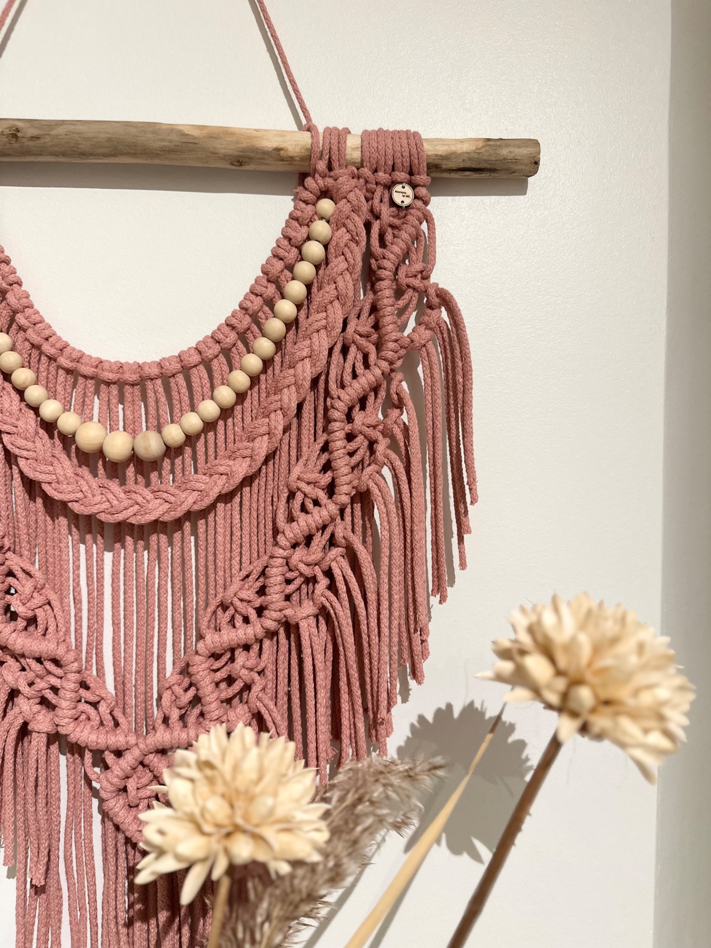 Makramee seinävaate 51x65cm, tehty luonnonpuuhun suomalaisesta kierrätyslangasta. Väri vanha roosa.