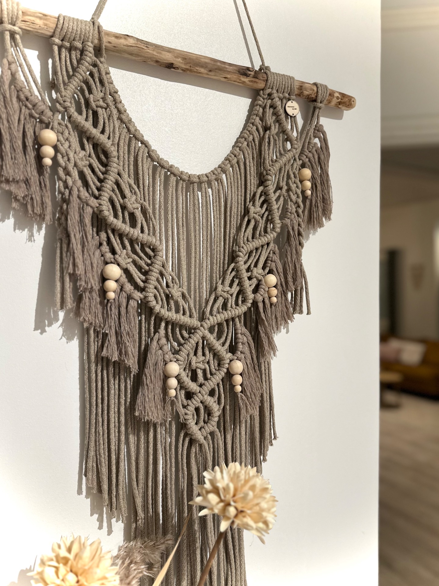 Makramee seinävaate 53x75cm, tehty luonnonpuuhun suomalaisesta kierrätyslangasta. Väri beige.